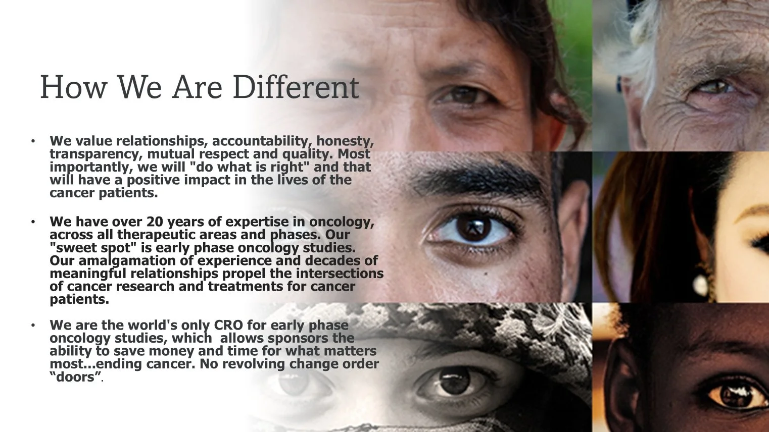 To help bring new, novel, and life-saving therapeutics to cancer patients sooner by applying our optimized SSU model and the GOSU to accelerate results, as well as proven and agile development processes to trials, saving biotech developers time and money.